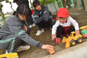 年少さんは、砂場遊びです。「車が通ります」「今、工事中です」お姉さんとのやりとりも楽しそうですねsad