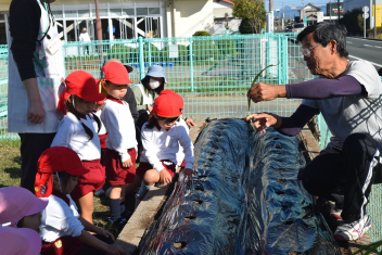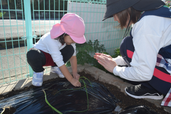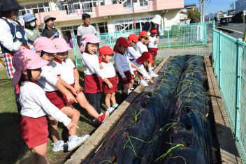 今日は、年中さん、年少さんがタマネギ苗植えをしました。畑の先生から、苗の持ち方や、土に植え方を教えてもらいました。「こんなに、小さなタマネギさんが、お世話すると大きくなるからね」