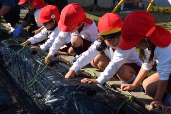 「土は、やさしくトントンしよう」「自分でできた!」初めてのタマネギ苗植えも、友達や先生と一緒に楽しく体験しました