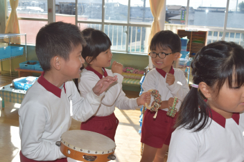 【年長】年長さんの部屋から、素敵な音が・・・「楽器にふれてみよう」「どんな音がでるかな」今日はピアノに合わせて、自分なりのリズム打ちをして楽しみました