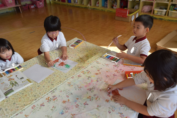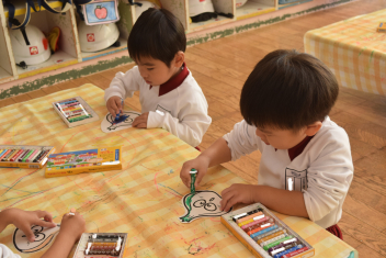 【年少】昨日のタマネギ苗植えの経験から、今日は看板作りです「何色のタマネギができるかな?」年少さんは、思い思いに色をぬって・・
