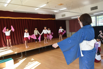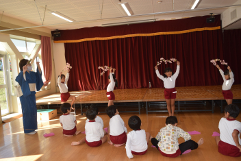 【年長】日本舞踊の先生を招き、「さくらさくら」を行いました。曲に合わせて、丁寧で、しなやかな動きを学びましたsad「去年の年長さんも、踊っていたね」憧れだったことを今年は、自分たちが披露しますsad