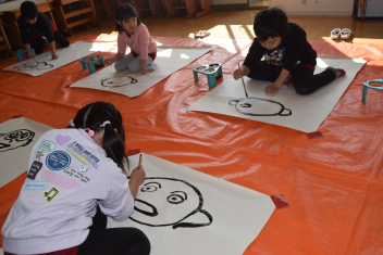 【年長】大きな模造紙を広げて・・「自分をかいてみよう」今日は墨を使って、ダイナミックに表現しますsad自分の目や口、耳など観察しながら、丁寧にかいています。どんな作品になるかな楽しみにしていますsad