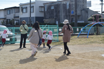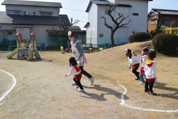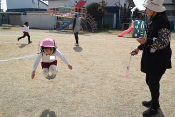 戸外では、元気よく一緒にマラソンです「もっと速く走れるよ」「縄跳びも見てほしい」いろいろなことが、自分でできるようになり、1つ1つに成長を感じますね