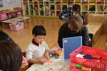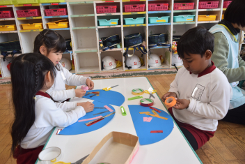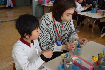 年長さんは、卒園式用のコサージュ作りです。講師の先生のお話をよく聞いて、丁寧に・・「お母さんの好きな色の花を選んだよ」「卒園式に付けるの、楽しみだねsad」親子製作を通して、幼稚園の思い出がまた1つ増えましたね