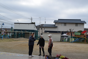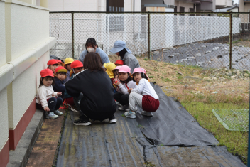 先生の言葉を聞いた園児は、幼稚園の裏に行き静かに隠れています。先生たちは様子を伺いながら、安全な場所を探します。どの子も落ち着いて避難することができました。
