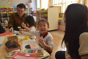 • 今日は参観会でした。お家の人と一緒に修了記念品作りをしましたsad自分の顔を製作・・難しいところは「お母さん、髪の毛つくって」のりの使い方も上手になってきましたね。