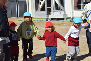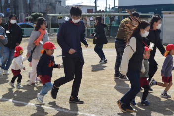 【年少】「よーい、どん」先生や友達とかけっこです。「先生、もう1回やろう」「次は、負けないよ~」体が温まってきたら、次は「かくれんぼしようよ」「いいねいいね~