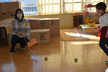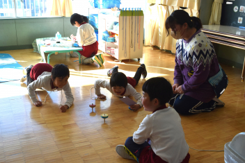 【年少】橋爪幼稚園では、どの学年もコマ遊びを楽しんでいます。年少さんは、友達と「せーので回そう」友達と一緒のもので遊ぶ楽しさを味わっています