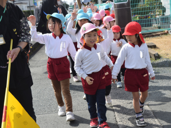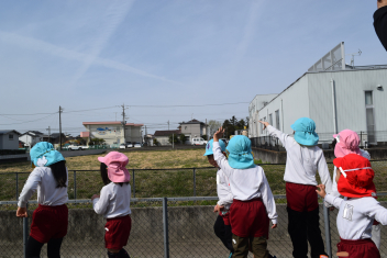「あ、幼稚園が見えたよ」「おーい」「聞こえるかな」遠くから幼稚園を見つけて手を振る子供たち。