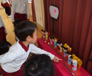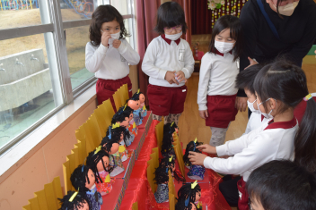 「見て、トイレットペーパーの芯が体だよ」「目も本物みたいに書いてあるよ」年中さんのひな人形を、年少さんがじっくり観察中・・