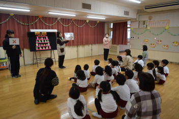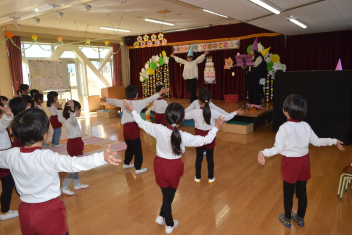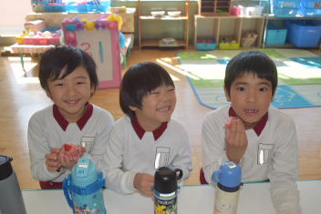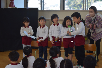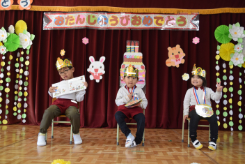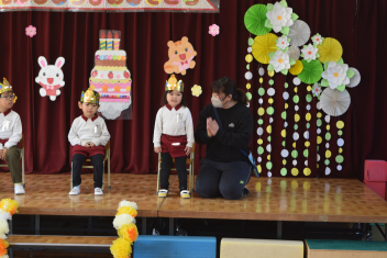 「今から誕生会をはじめます」司会の引継ぎも今日が最後です「年中さん、頼んだよ」年長さんが傍で言葉を教えてくれましたね。