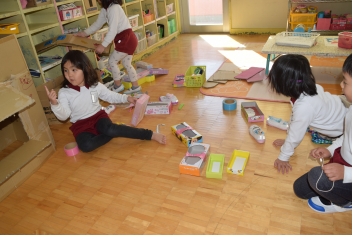【年中】いろいろな空き箱を並べ、「これがいいかな」「少し、小さいかな」作りたいものをイメージしながら材料選びをする年中さん。これが遊びを通して試したり、工夫したりする姿ですねsad