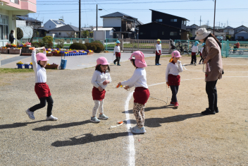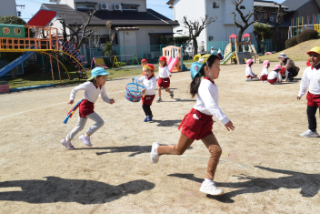 【異年齢】園庭の真ん中で、しっぽ取りが始まりました「いれて、いれて」と参加する年少さん。年長さんを頑張って、追いかける姿がかわいらしいですねsad年長さんは、時々後ろを振り返り、速度をおとして走ってくれました。ここでも思いやりの心が育っていますねsad