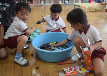 【年少】どんぐりをタライの中にいれて、手で回したら、「ゴロゴロ」「グルグル」音がするねsadカップに入れて「ごちそうです」秋の自然物との出会い・・