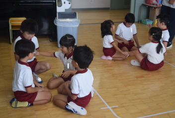 【年長】「もっと、引っ張った方がいいと思う」「みんなで声をそろえるといい」等、気付いたことを伝え合う姿が見られましたsad年長さんは、このような振り返りの工夫もしていますsad