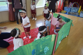【年中】カラーポリ袋で大きなてるてる坊主をつくった年中さん。「これで、大丈夫」みんな遠足をとても楽しみにしています