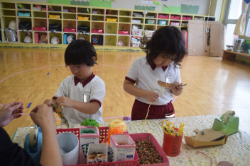 【年少】「どんぐりをいっぱい拾ったね」年少さんは、折り紙でどんぐり作りです。いろいろな目をシールで付けたら・・かわいいどんぐりさんの出来上がりそれぞれの学年が、遠足の思い出を振り返り、絵画製作を楽しみました。
