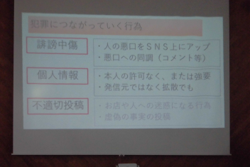 ネット上で誹謗中傷しないことや、ネットに他人の画像や動画を勝手に投稿しないことなど、ネット上に潜んでいる様々な危険を回避するポイントについて教えていただきました。