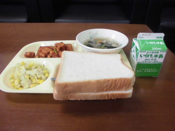 パン、牛乳、いかのトマトソースあえ、キャベツソテー、野菜 スープ