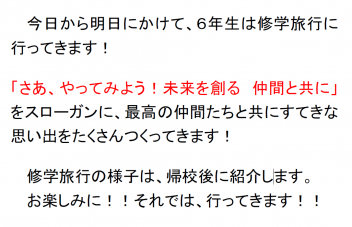 •  本日、6年生が無事に修学旅行から初生小学校に帰ってきました。