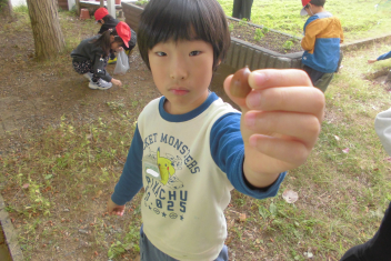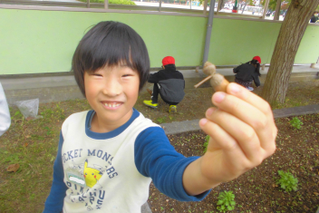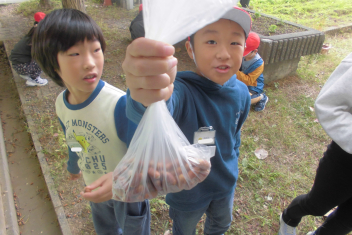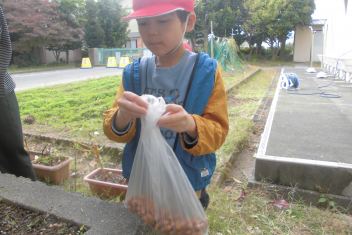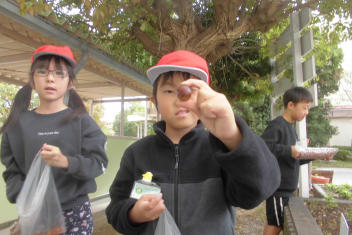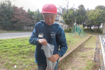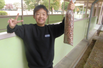•  体育館へ向かうために通路を歩いていると、通路わきでみどり学級の子供たちがいろいろな形や大きさのどんぐりを拾っていました。