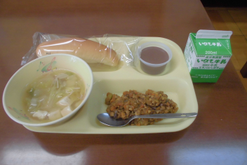 パン、牛  乳、豆 のドライカレー、豆腐 スープ、ココア豆乳 プリン