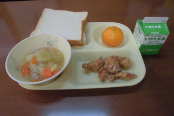 パン、牛乳、鶏肉の米粉揚げ、ポトフ、みかん