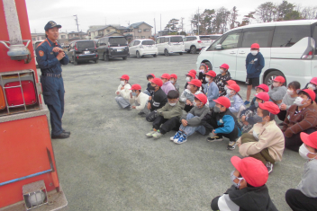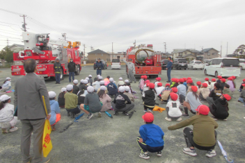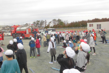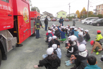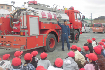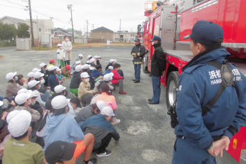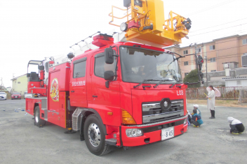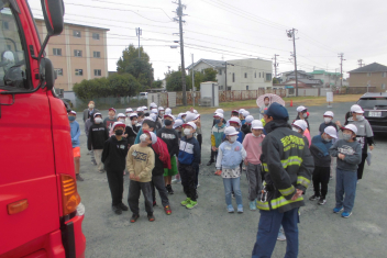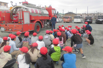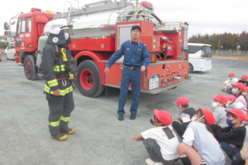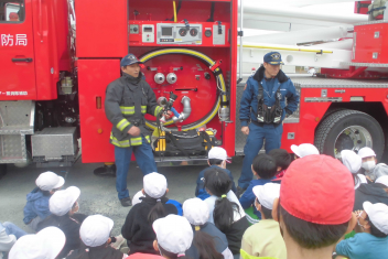 消防士の方を講師としてお招きし、給水車とはしご車のつくりや役割について詳しく説明していただきました。