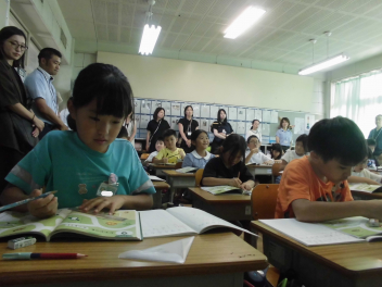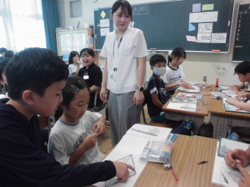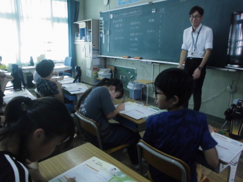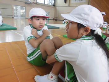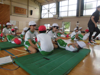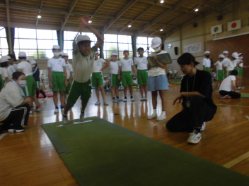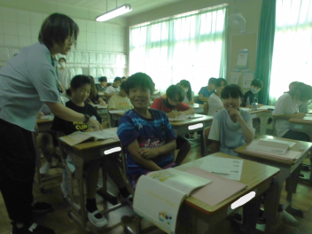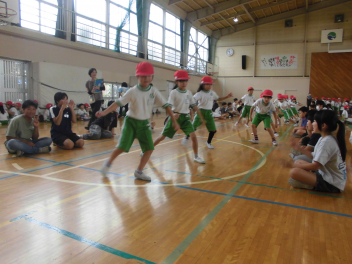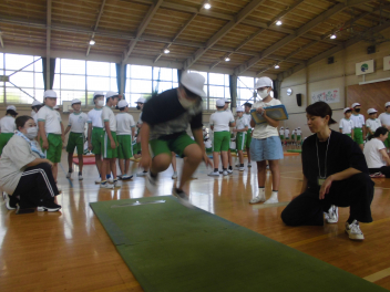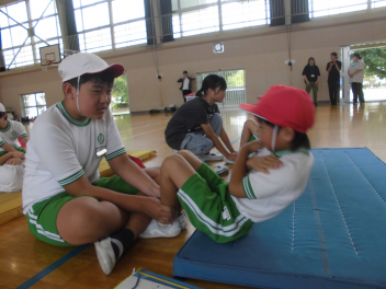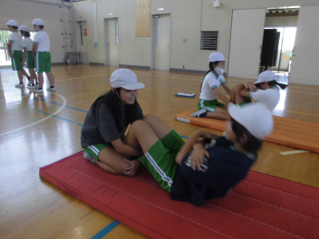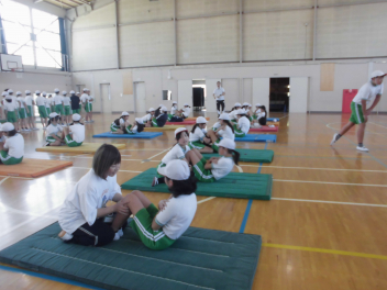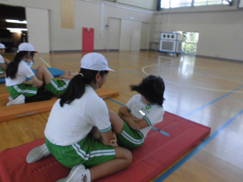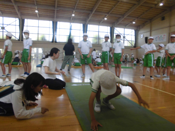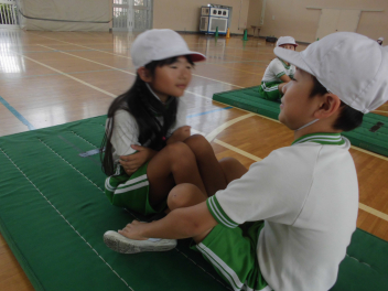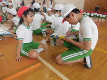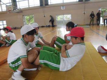 運動場種目(50m走・ソフトボール投げ)と体育館種目(立ち幅跳び・長座体位前屈・反復横跳び・上体起こし)の計6種目を測定しました。1年生の上体起こしと反復横跳びの測定には、6年生のお兄さんとお姉さんが手伝ってくれました。1年生は、初めての新体力テストでしたが、6年生のサポートもあり最後まで力いっぱ取り組むことができました。