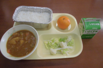 麦入 りごはん、牛  乳、ポークカレー、カリフラワーのサラダ、みかん