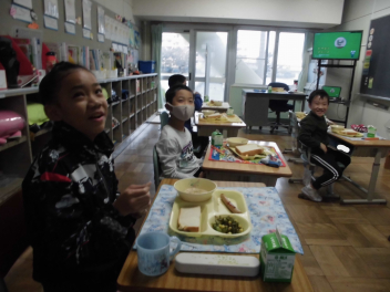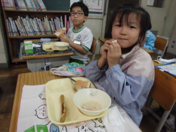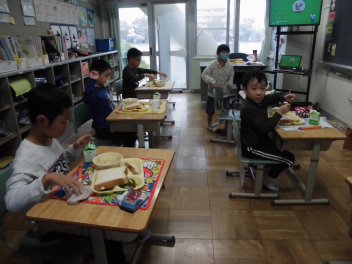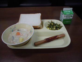 パン、牛  乳、ウインナーソーセージ 、くきわかめサラダ、さつまいものシチュー