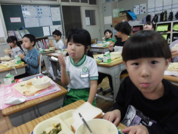 日本 には、春夏秋冬 の4つの季節 があり、季節 ごとに違 った食 べ物 がとれます。その食 べ物 が1 年 で1 番多 くとれる季節 を「旬 」といいます。旬 の食 べ物 は、おいしく、新鮮 で、値段 も安 く、栄養 が多 くなるものもあります。さつまいもは、秋 が旬 の食 べ物 です。今日 は、さつまいもを使 ってシチューを作 りました。さつまいもを使 うことで、いつもより甘 みがあるシチューに仕上 がっています。旬 の食 べ物 を味 わいましょう。