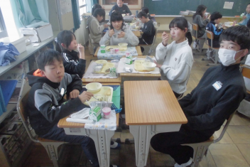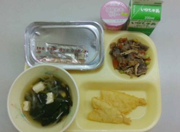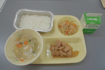 • ごはん、牛乳、鶏肉の照り煮、もやしのごま酢あえ、みそ汁