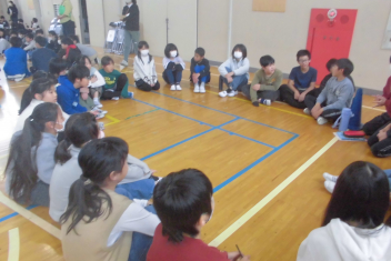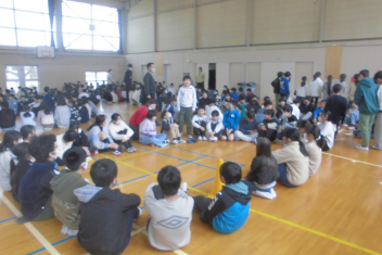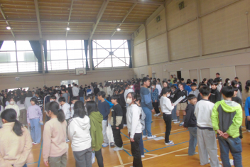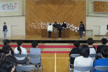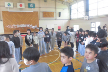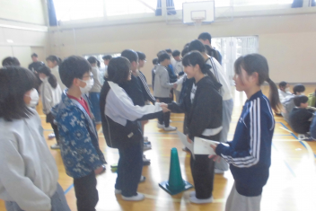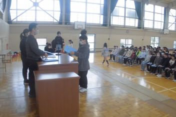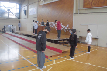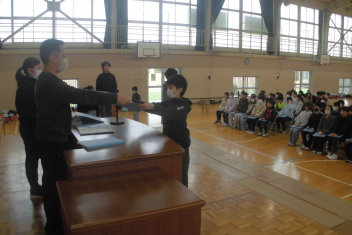•  今日の昼休みに、5・6年生が体育館で委員会引継ぎ式を行いました。