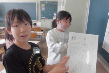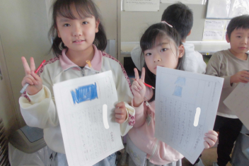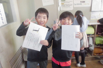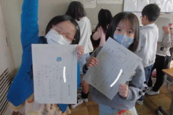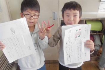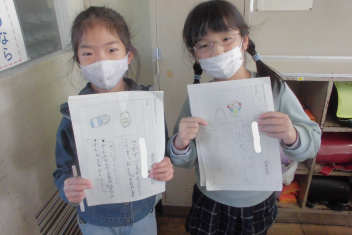 何人かの子供たちが、私にも紹介してくれました。おもちゃの材料や作り方、遊び方について、分かりやすく文章にまとめることができていました。また、絵を加えるなどの工夫もしており、とても読みやすい説明文でした。2年生の大きな成長を感じます。