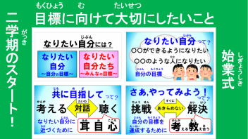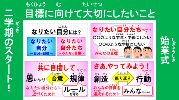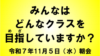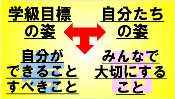 「なりたい自分たちを目指して!~みんなは、どんなクラスを目指していますか?~」について話しました。この話を受け、それぞれのクラスで「学級目標=クラスのみんなで目指す目標」について改めて話し合う機会を設けています。