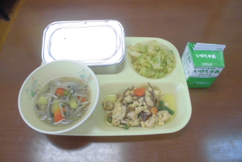 • ごはん、牛乳、親子煮、キャベツのアーモンドあえ、さつまいものみそ汁