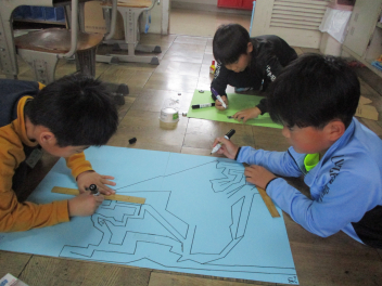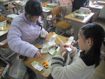 •  4年生の教室に行ってみると、図画工作科で作成した版画の作品を台紙に張っていました。