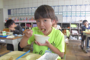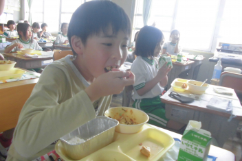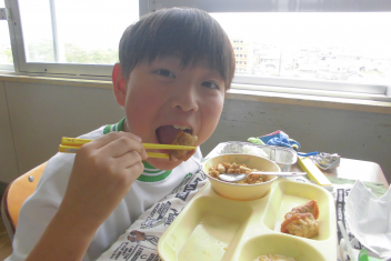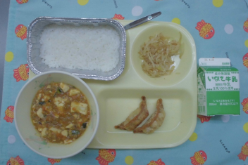 • ごはん、牛  乳、マーボー豆腐、揚 げぎょうざ、もやしの中華 あえ