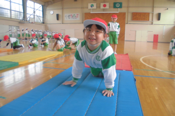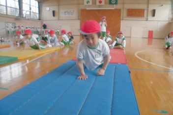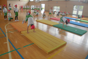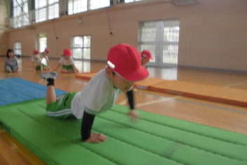 この時間は、いろいろなマット遊びにつながる「動き作り」に取り組んでいました。あざらしになったりうさぎになったり、子供たちは楽しみながらマット遊びの素地となる動きを経験していました。