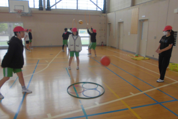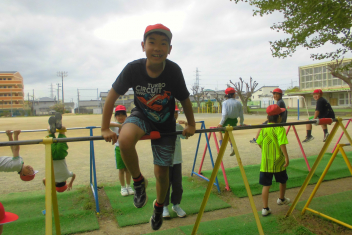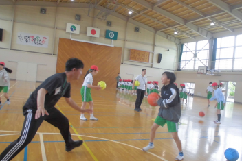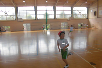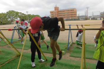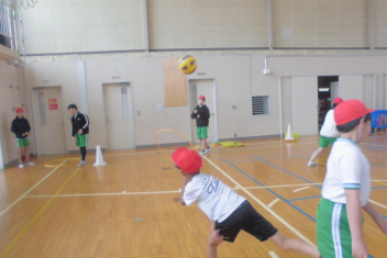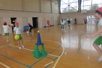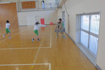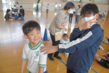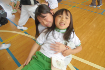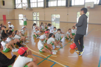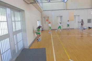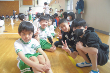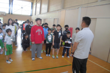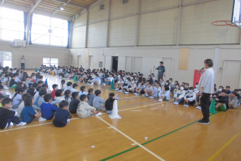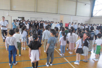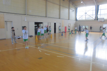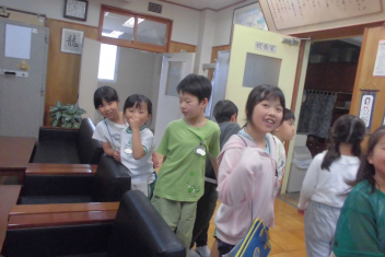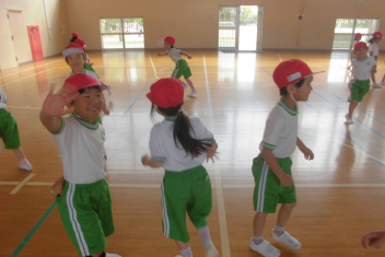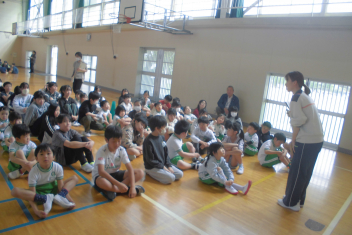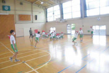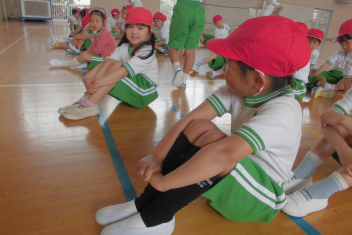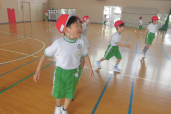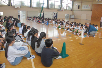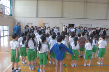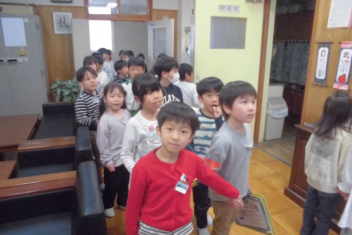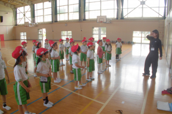訓練の目的は、第一次避難(自分の身を守る方法を確認する)⇒第二次避難(お・は・し・もを守り、安全な経路を通って運動場に避難する方法を確認する)の2つ。