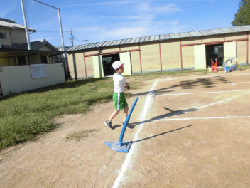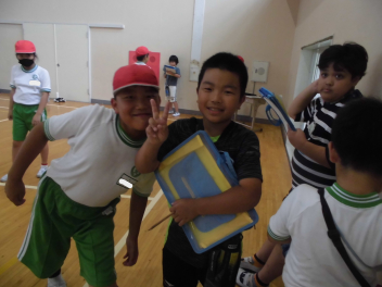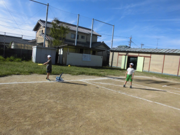 この日は、ボールを打つ用具(ラケットORバット)を選び、グループごとにバッティングゲーム(打球が飛んだ距離を得点化)を楽しみました。