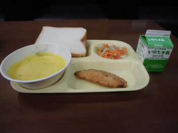 パン、牛乳、さけフライ、にんじんとアーモンドのサラダ、かぼちゃのポタージュ