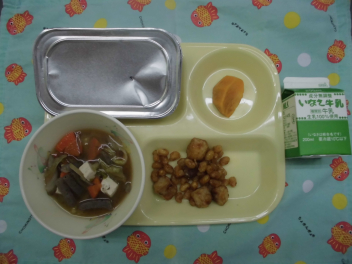 • ごはん、牛  乳、しいらと大豆 の甘辛 あえ、実 だくさんみそ汁、かき