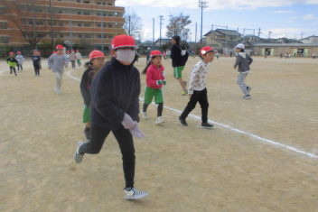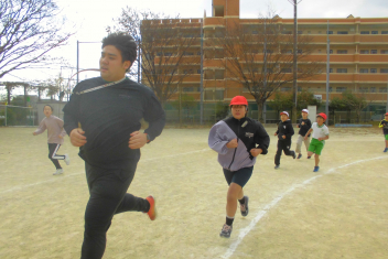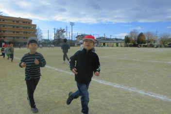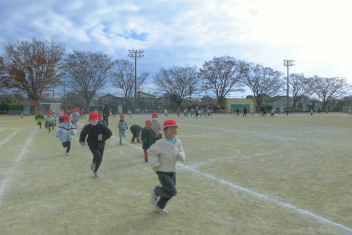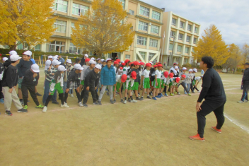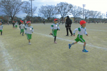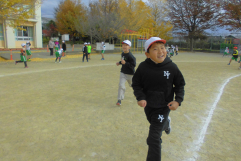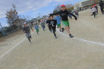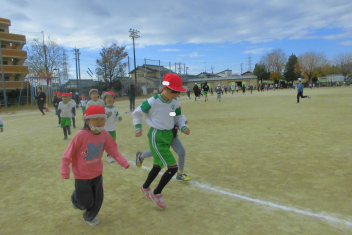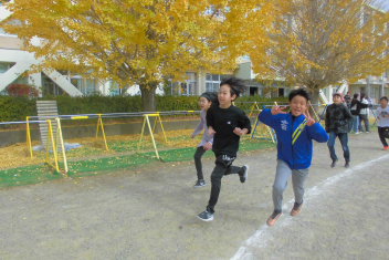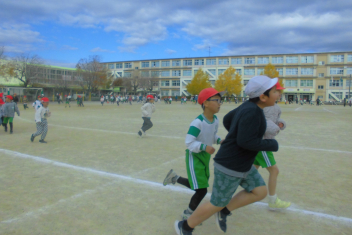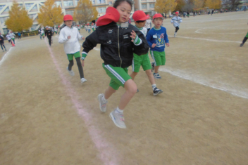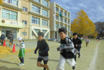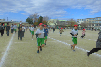 自分の目標に向かって、最後まで粘り強く走り抜く姿と、目標に向かって走る友達に勇気を与える熱い声援を期待します。頑張れ!初生小の子供たち