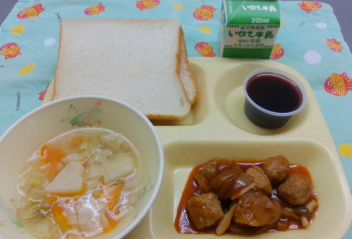 パン 、牛乳、煮込みミートボール、アルファベットスープ、ぶどうゼリー