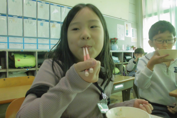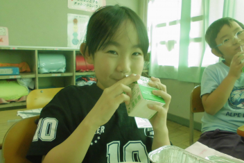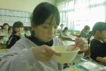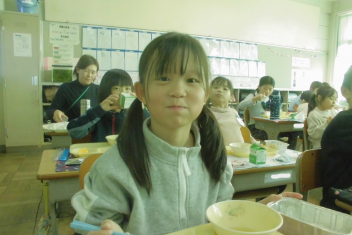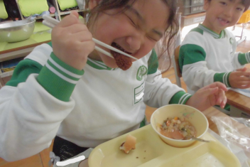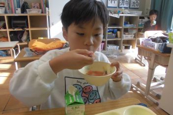 スープに入 っている粒 は、もち米 の玄米 です。玄米 は精米 されていない米 で、薄 い茶色 をしています。白米 よりもビタミンやミネラル、食物 せんいがたくさん含 まれているため、体 の調子 を整 えてくれたり、おなかの掃除 をしてくれたりします。今日 は、食 べやすいように加工 されたもち米 の玄米 をトマトスープに入 れました。プチプチとした食感 を楽 しんでください。