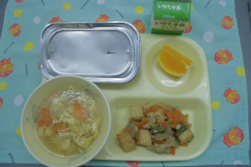 • ごはん、牛  乳、生揚 げの五目炒 め、卵 スープ、オレンジ