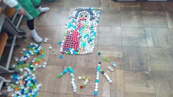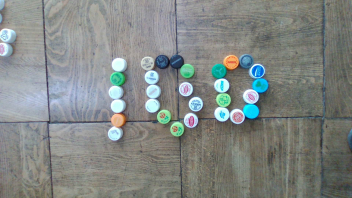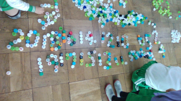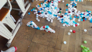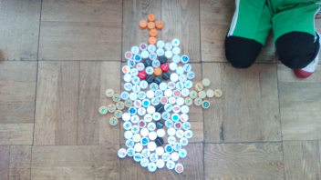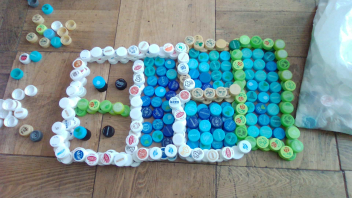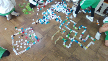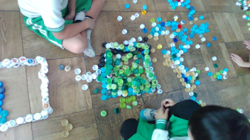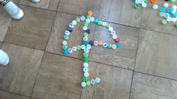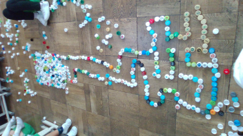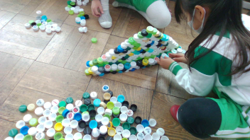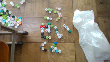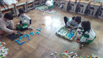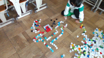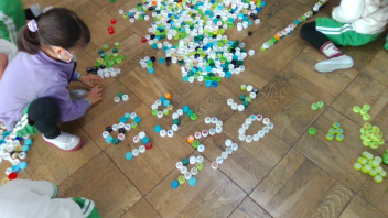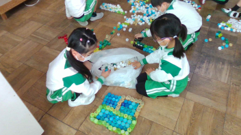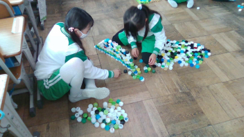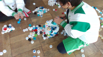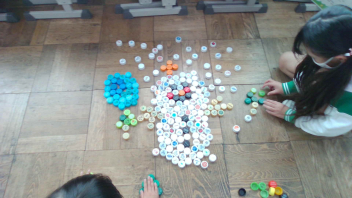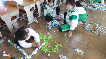 教室の中には、いろいろな色のペットボトルキャップがたくさん